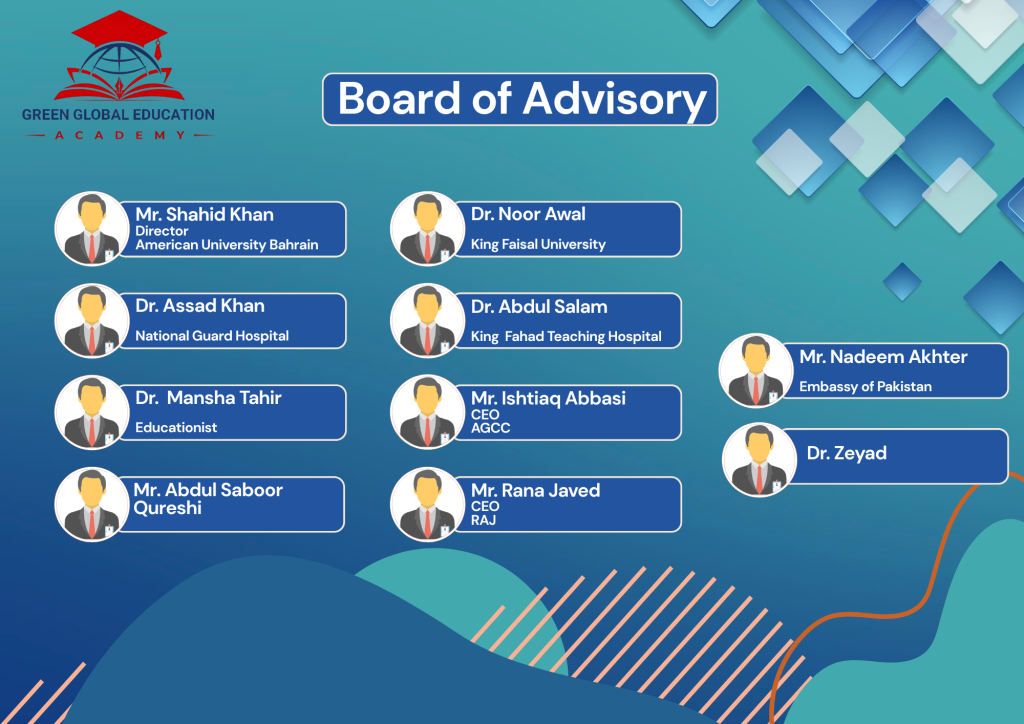 At Green Global Educational Academy, we are guided by a team of experienced educators, professionals, and community leaders who form our Board of Advisory. This board plays a key role in providing strategic direction, educational insight, and quality oversight — ensuring our academy remains true to its mission of delivering academic excellence, moral education, and holistic student growth.